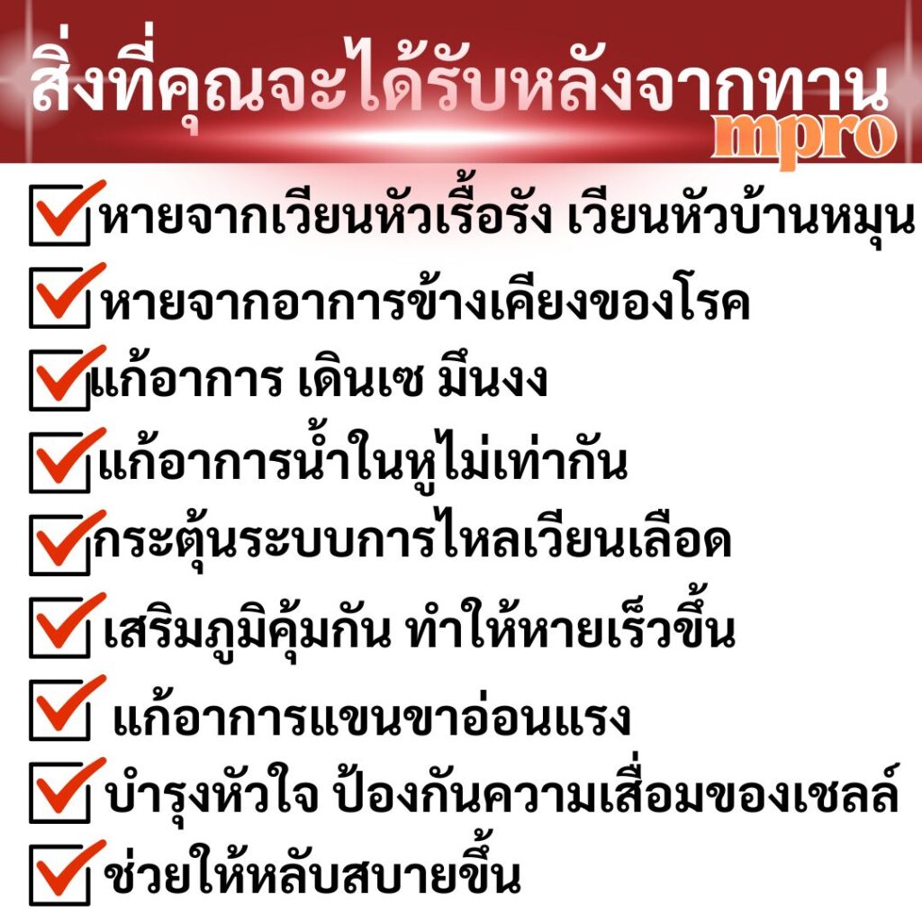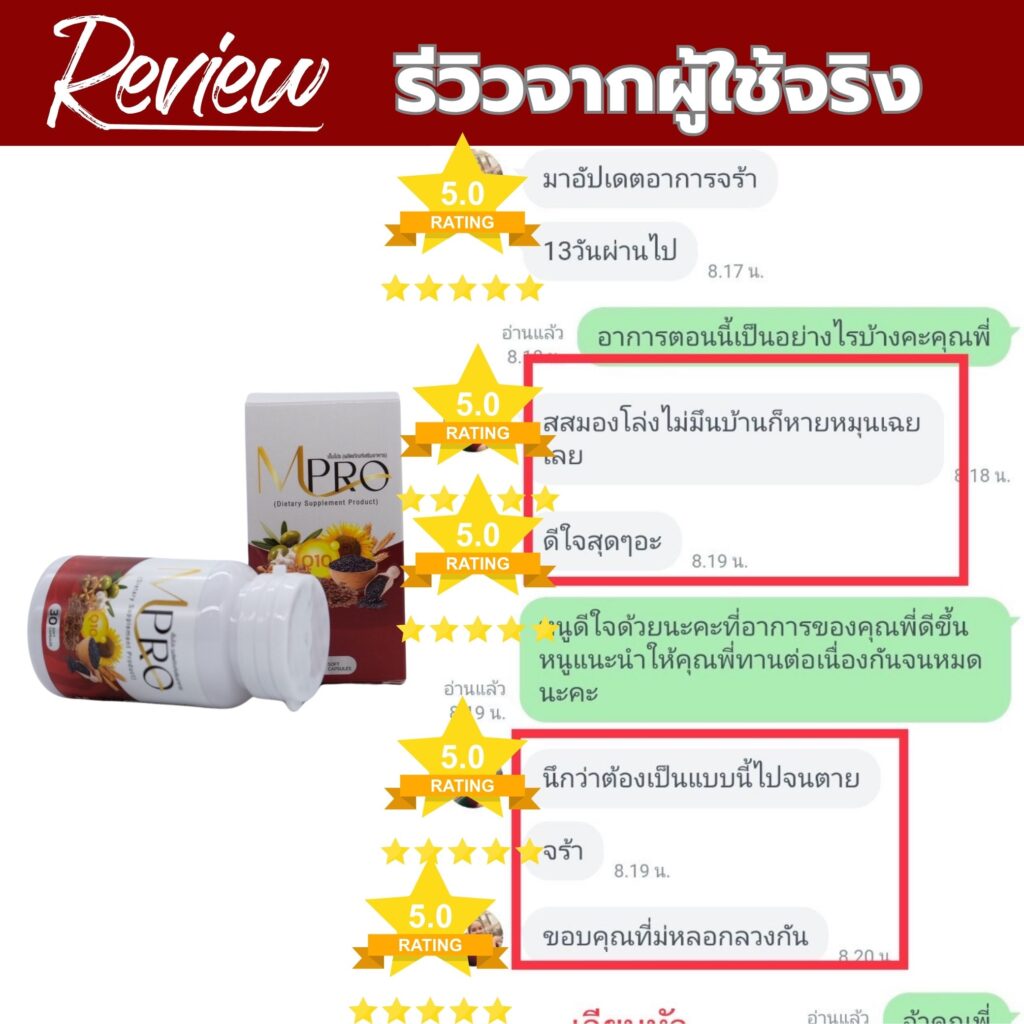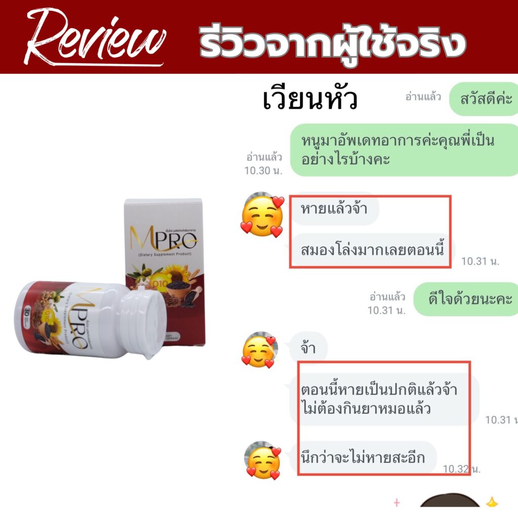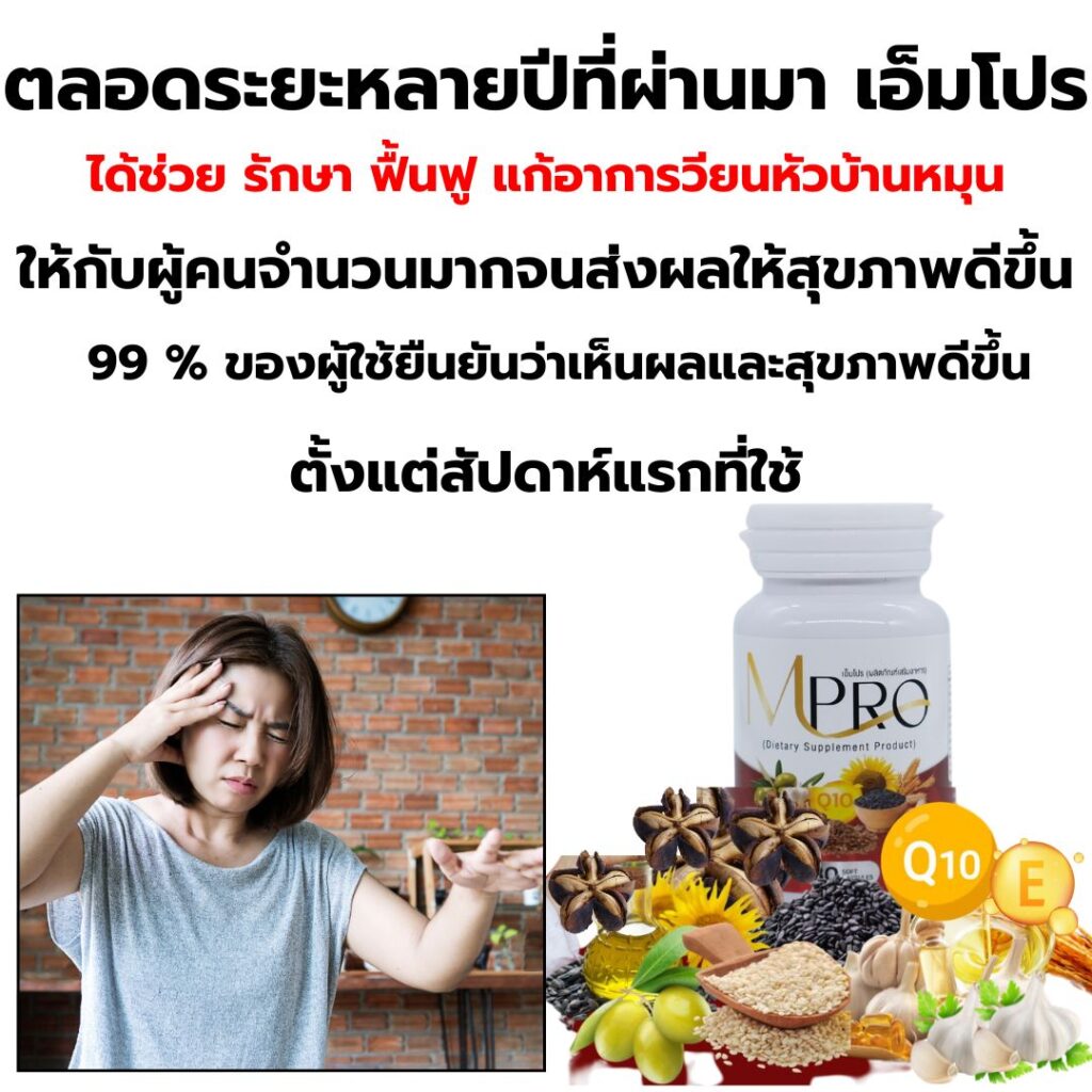 จนวันหนึ่ง เพื่อนสนิทมาเยี่ยม เธอได้แนะนำ ผลิตภัณฑ์ “เอ็มโปร”เธอบอกว่า แม่ของเธอก็หายจากอาการเหล่านี้เพราะทานตัวนี้ เอ็มโปร เป็นสูตรบำรุงระบบประสาท สมอง และการทรงตัวช่วยให้สมดุลในร่างกายดีขึ้น รักษาที่ต้นตอ โดยเฉพาะกลุ่มที่มีปัญหาเวียนหัว บ้านหมุน ตอนแรกก็ลังเล กลัวเสียเงินฟรี แต่ก็ตัดสินใจลองดูอีกครั้ง เลยเข้าไปสั่งสินค้าแล้วสอบถามเจ้าหน้าที่และเขาก็ได้แนะนำ การทานและปฎิบัติตัว